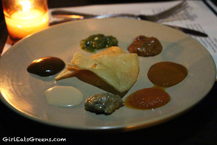 There was also this really fun sampler of salsas we went for. There were 7 salsas in total to try, and they came in cute little cups with spoons for easy chip placement. The habanero salsa was so hot I had to chug the last of my margarita to cool my mouth off. (not such an issue on a night like this).