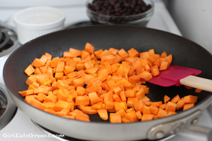 1. Sauté chopped sweet potatoes in a greased skillet over medium heat until they start to brown a bit. (I like to use spray olive oil to keep the amount of oil down)