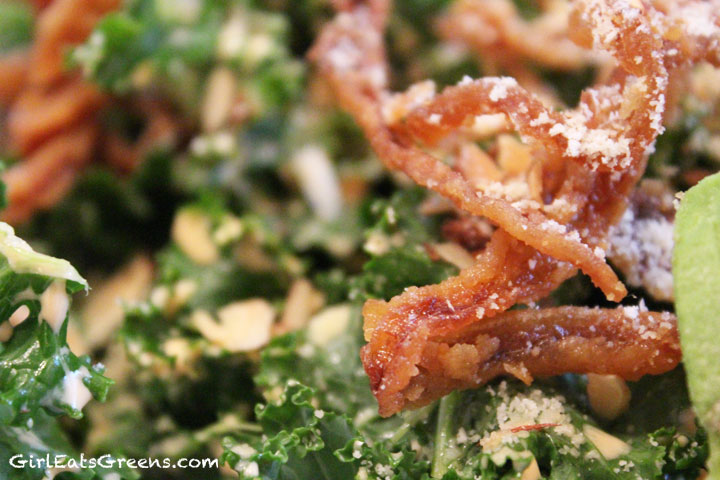 I absolutely love love loved my spicy Cesar kale salad. I ordered with tempeh, but [see example above and imagine the French accent] they were out. So I took our waiter up on his offer for zucchini bacon instead.