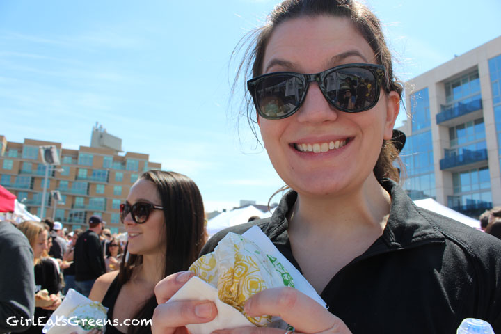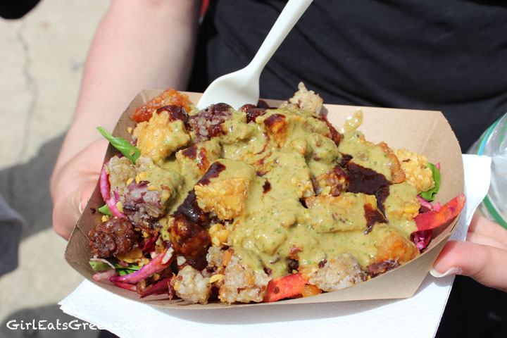 After taking a little break after the Ramen Burger, I decided I couldn’t have come all the way to Brooklyn and NOT visit at least one of the strictly vegan food stands. There’s one stand called Barry’s Tempeh that really called out to me. I’m kind of so-so on tempeh, but Barry must know what he’s doing, because this was downright delicious. They had a few samples out on the table to try, and once I popped on in my mouth I was sold.