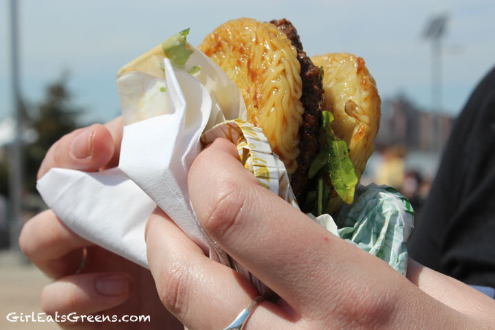 Smorgasburg is a plethora of food vendors who get all their tents together and have epic party of sorts. Food galore. There’s vegan stands and pulled pork stands and ice cream sandwich stands and wing stands and popcorn stands and slushie stands and pigs in a blanket stands and… you get the idea. Lots and lots of food. Now perhaps the most coveted of foods at Smorgasburg is the infamous Ramen Burger. What is a Ramen Burger? Exactly what it sounds like. A burger with ramen. The ramen is actually formed into the buns for the burger. Voilá. Ramen Burger.