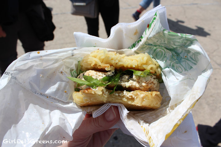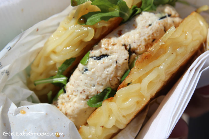 I wasn’t nearly as excited about the Ramen Burger experience as Erin was, I had assumed that there wouldn’t be vegan option at a stand known for it’s burgers. I have to say, I was pleasantly surprised when I met up with Erin and she had made it to the front of the line and the sign said “tofu.” A tofu option! I had no idea this was a possibility. I hadn’t read about it anywhere, and none of my meat-eating friends had heard of it either. I simply had to partake (after confirming of course that there wasn’t anything funny in it I should know about).