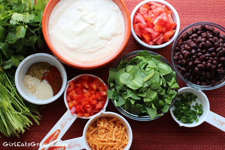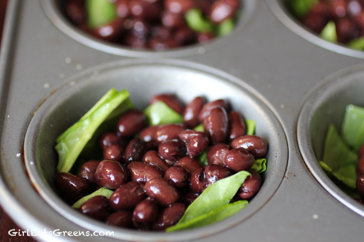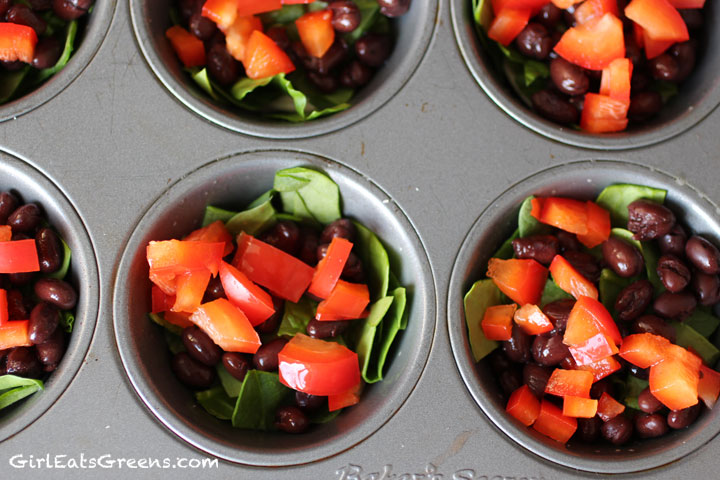 4. Spray the muffin tins with an oil to keep everything from sticking and start layering! Lay the tortilla down first, followed by spinach, beans, peppers, tomato, and top with the tofu egg mixture. Put the cheese on the very top of everything. Depending on how large your muffin tins are, you may have some ingredients left over (I only had a touch of the tofu mixture left over, everything else fit in perfectly)
