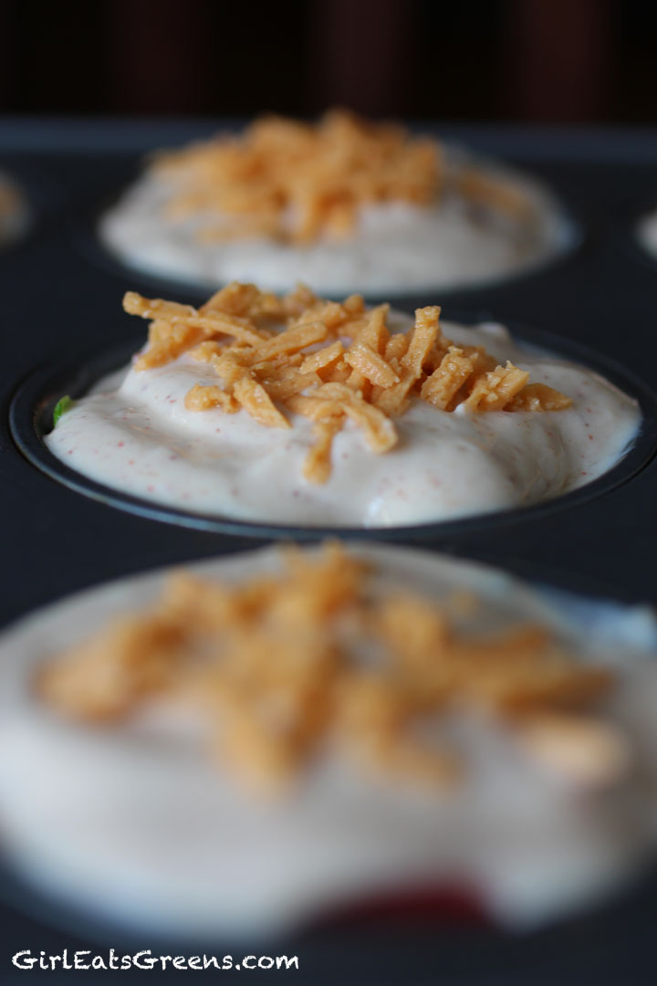 For the “crust” I managed to cut corn tortillas to fill out the insides of the muffin tins, which was a bit cumbersome but I think in the end definitely worth it, because without the crust there wouldn’t have been much to hold the bottom from falling out. I really enjoyed layering everything up in the tins. I kept thinking, “this is going to look so cool if it works out!” Surprisingly, it did!
