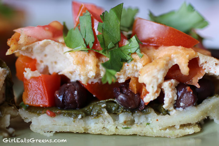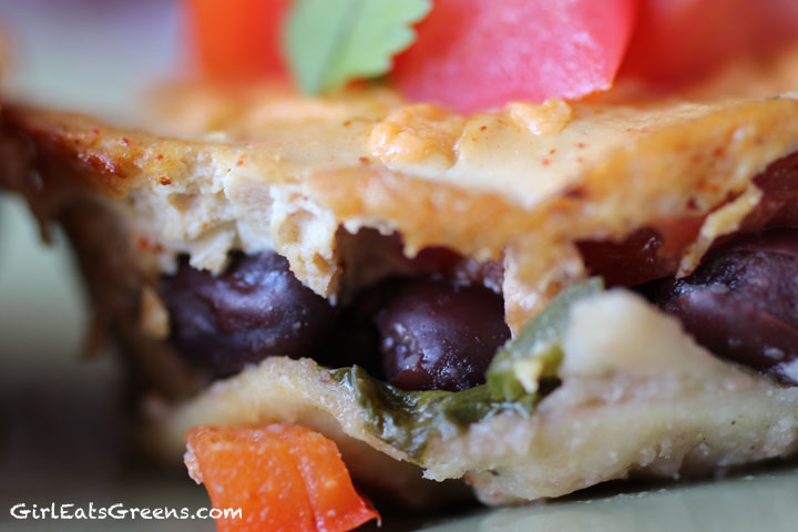 To get that layered feel, I went with corn tortillas as the crust, and made the layers out of black beans, tomato, spinach, peppers (red & jalapeño), and then for the “egg” I used silken tofu mixed with a little egg replacer to keep it firm. I topped everything with a bit of Daiya cheese, which is the one vegan cheese replacer that I actually love. Seriously, if you haven’t checked out Daiya yet – you must. You can find it now in most grocery stores that have a healthy section or a health focus. (seriously, I even found it at the grocery store in Wisconsin when I was home for the holidays so I know it’s not just an East coast Whole Foods thing).