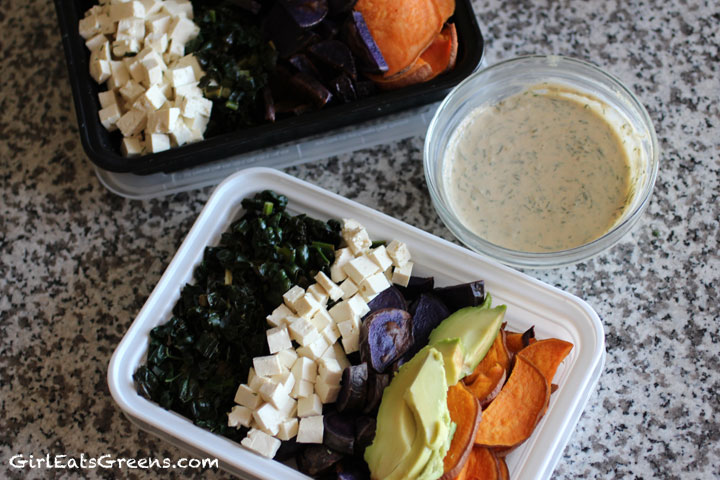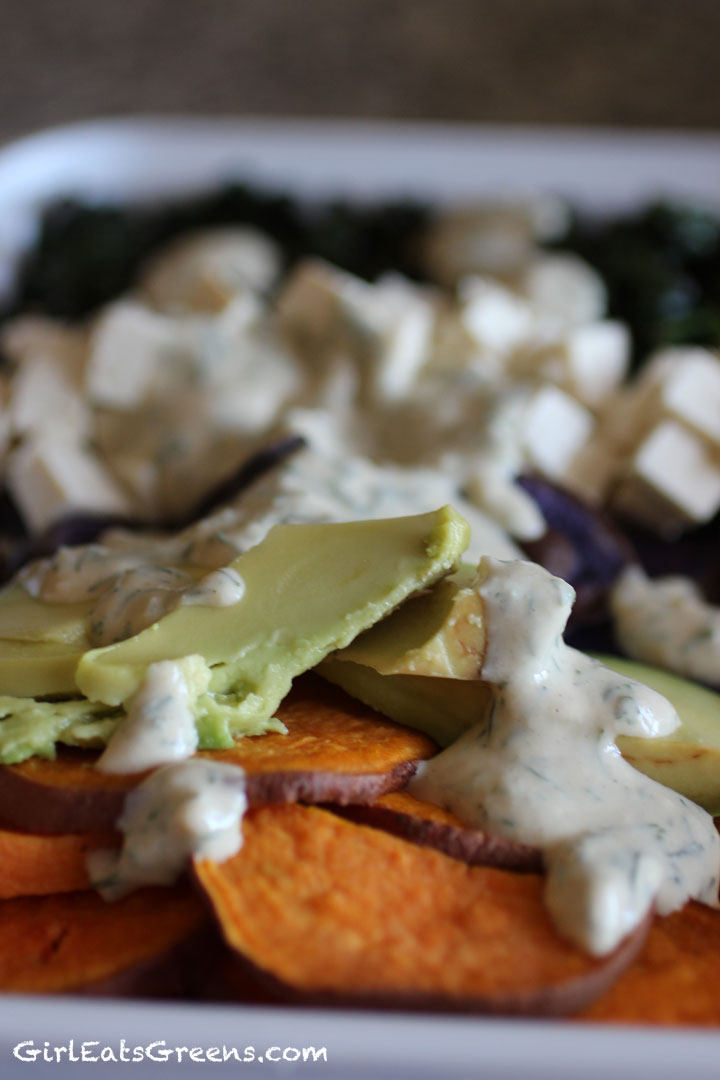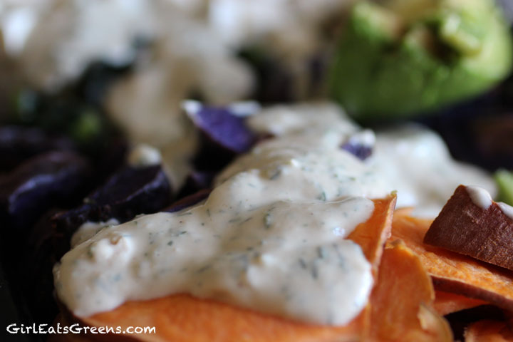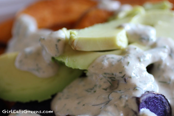 The first time I whipped up the sauce, I put it on asparagus, chickpeas, and purple potatoes. When I actually snapped a couple shots of it here, I served it over roasted sweet potatoes, purple potatoes, sautéed kale, avocado and cubed tofu. The tahini gave the sauce a really great creaminess and the fresh dill gave it a terrific spring or summer feel. The lemon added a great tanginess, and it was especially delicious with asparagus (maybe because I used to love hollandaise sauce on asparagus and this was faintly reminiscent of that).