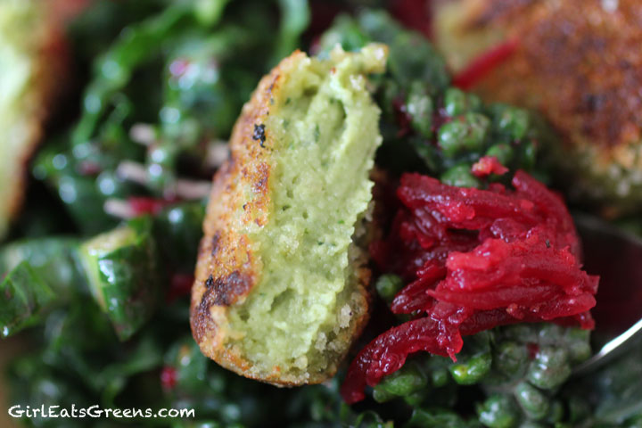 vegan fried cashew goat cheese kale saladI was amazed this was one of those recipes that I hit right on the first try. That doesn’t always happen. It’s a rare and exciting thing when it does. Crispy on the outside, gooey on the inside, the fried “cheese” was exactly what I was looking for.