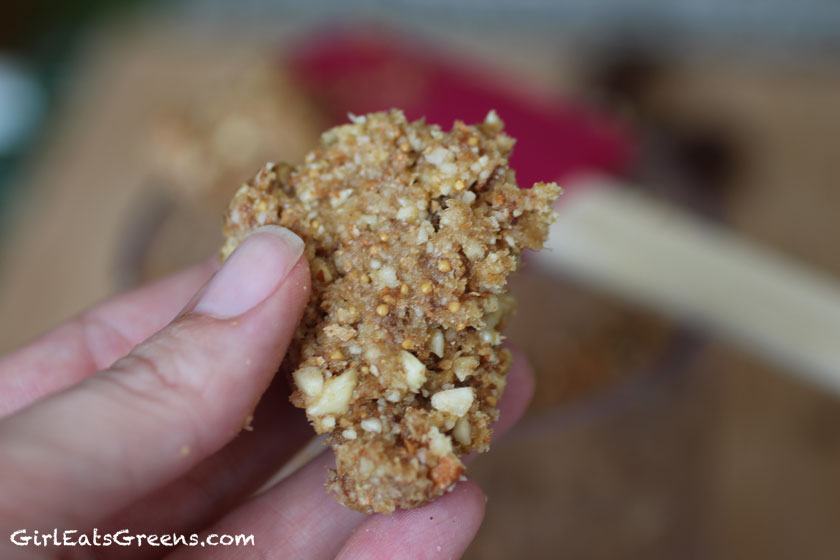 For the crust I decided to go with something a little more wholesome than the typical graham cracker crust on many cheesecakes. I once made a pumpkin pie for Thanksgiving with a date and almond crust, and decided to use that as my inspiration. For this one, I used almonds, dates, and figs. Just a few twirls around the high powered food processor, and you’ve got yourself a crust that can easily be molded and stays together well.