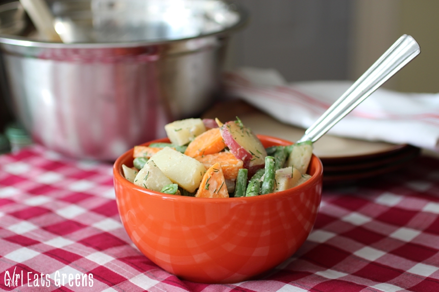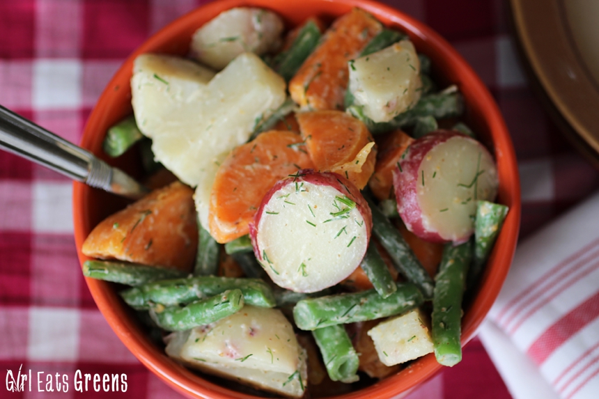 Ah summer time. Isn’t it just a perfect time for picnics and cookouts and checkered tablecloths and potato salad? I have a different take on a potato salad to share with you all today, but first – what’s a food story without a little backstory? It all started when I picked up some green beans at the farmer’s market and didn’t really know what I wanted to do with them. I love green beans, but I have yet to figure out really what to make them into other than a side dish. For some reason they reminded me of potato salad. You can put green beans in a potato salad, right?