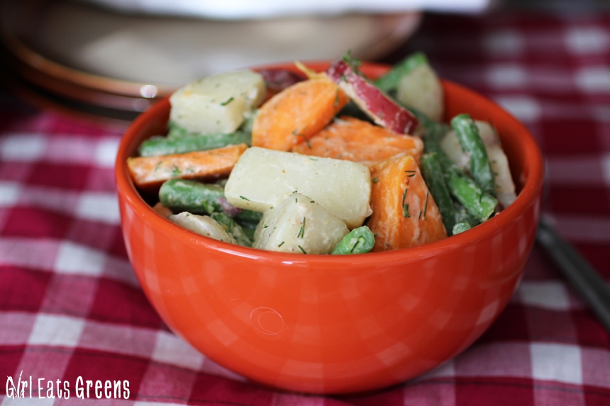 Since I was already getting a little weird by throwing in some green beans, I decided to go with a combo of sweet potato and red potato to get even more color incorporated. The combination was surprisingly good – the sweet potato added a great twist that I wasn’t sure I was going to like at first but I ended up loving it. The added sweetness was a pleasant addition. (side note: did you know that purple beans are really just green after you cook them? Yes, it’s true. A discovery I was sad to have made during this cooking expedition.)