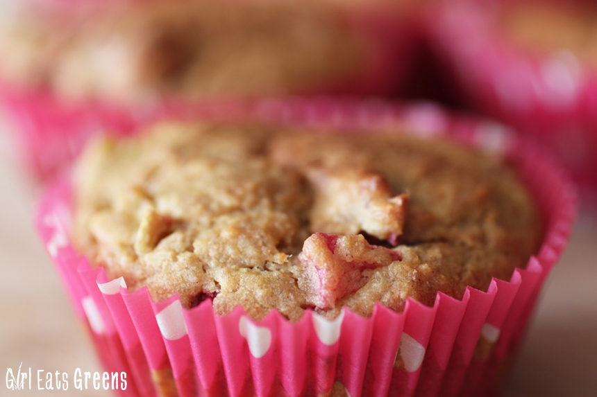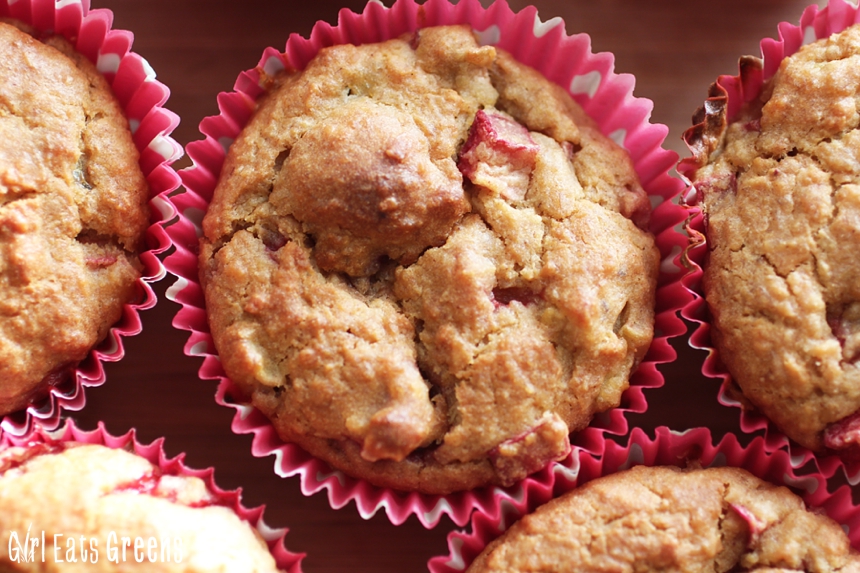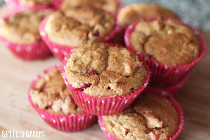 I’ve been playing around with different ingredients, different flavors, and this one is one that really deserves a blog post.I wanted something that tasted delicious but was also low-sugar, high protein, and packed with fresh fruit. Inspired by the rhubarb I’ve been seeing at the farmer’s market, and further inspired by my strawberry rhubarb coconut crisp pie, I ended up with these strawberry rhubarb muffins.