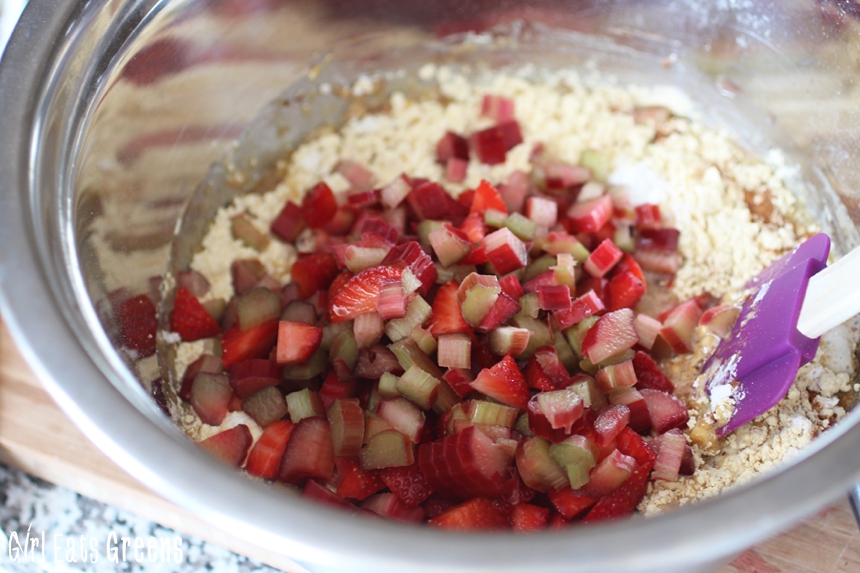 - Fold the wet ingredients into the dry and add strawberry & rhubarb, mixing well.