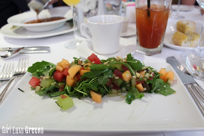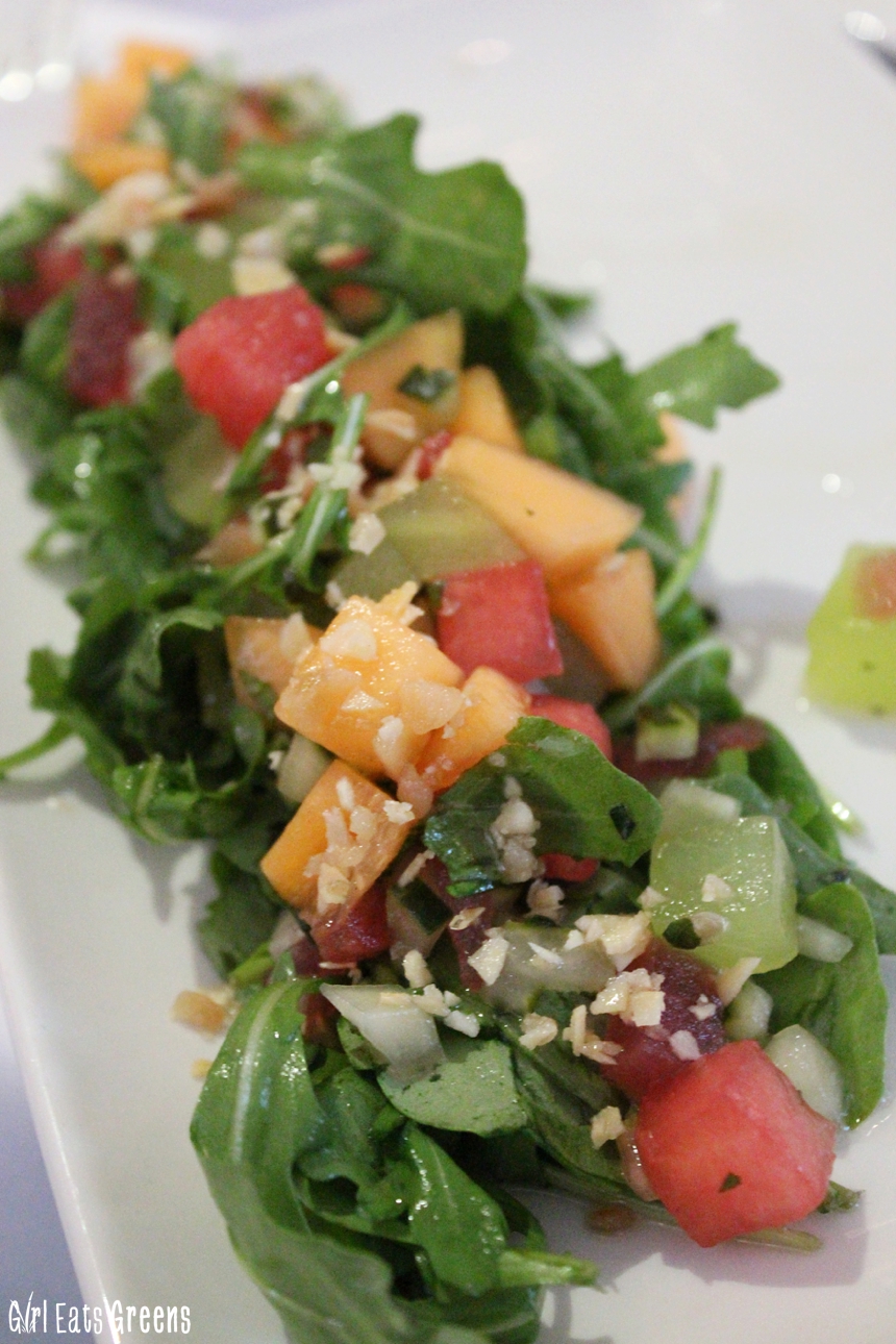 I decided to start with the arugula and melon salad which normally came with a honey yogurt dressing. I didn’t miss that dressing one bit. The melon was bursting with flavor, the arugula had the perfect amount of peppery bite, and whatever dressing they did put on there added a hint of tang.