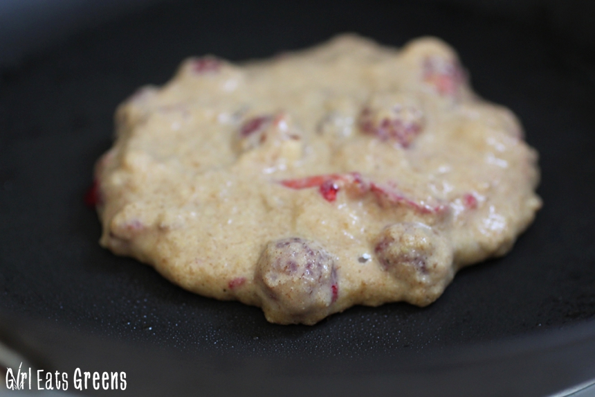 Very Berry Pancakes Raspberry Strawberry Gluten Free Vegan Girl Eats Greens_0028 Very Berry Pancakes Raspberry Strawberry Gluten Free Vegan Girl Eats Greens_0025Very Berry Pancakes Raspberry Strawberry Gluten Free Vegan Girl Eats Greens_0024I chopped up the strawberries to be smaller than bite-sized but left the raspberries whole. I was extremely careful when mixing everything together to not squish the berries – in case I would end up with entirely pink pancakes. Though in the event of Valentine’s Day, that could be a cute option.