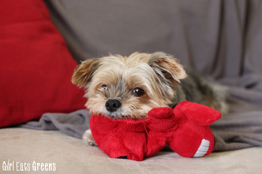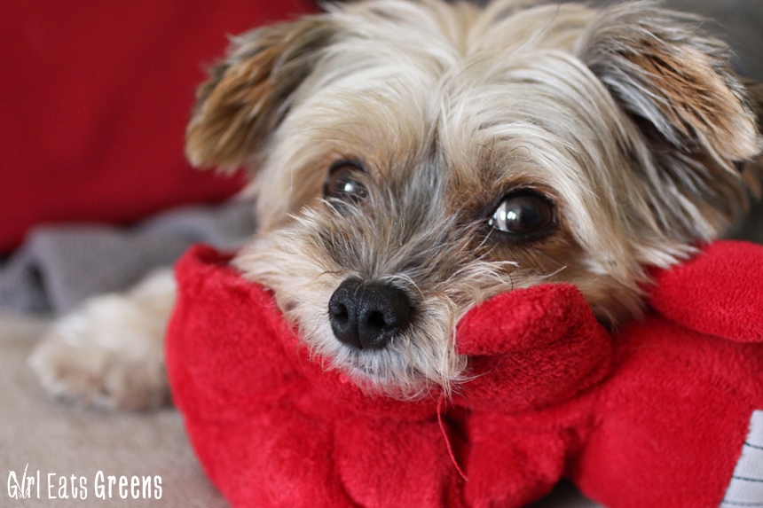 Someday, I swear I’m going to get a griddle. In the meantime, my pancake process is ridiculously slow. I make one at a time in my frying pan. If you’re like me and somewhat kitchen challenged, just be patient. And put the oven on 200 degrees. As each cake comes off the frying pan, place it in the oven to keep warm until you’re ready to serve. In the meantime, they set off a delicious smell all through the apartment. Even this little pup was intrigued. (yes, it’s a gratuitous dog shot – but I just couldn’t help but share. She was closely watching from the couch and had her best begging puppy eyes on hoping for some scraps to fall).