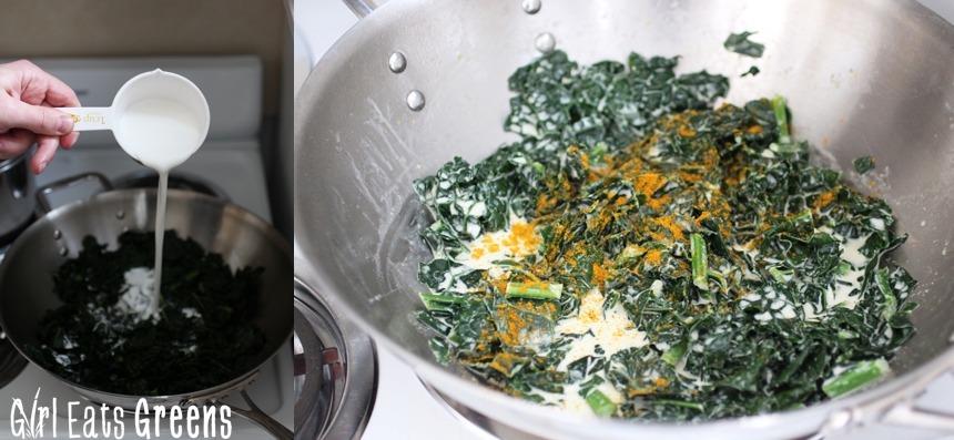 I decided the quickest way to replace the cream was with coconut cream to get around having to soak or boil cashews to make cream. And since the flavor of coconut would be inevitable, I decided to really go with it and play up that flavor. I added a touch of curry powder to give everything even more of a coconut-curry taste. I also added in a bit of nutritional yeast for more of a cheesy touch and I have to say, when everything came together the kale was super tender, slightly sweet, with a tiny bit of spice. I was in heaven.