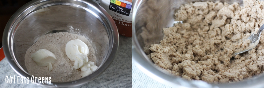 Preheat oven to 425. Place the flour and shortening in a large bowl and cut together with a fork until it starts to form pea-sized chunks. Start adding ice cold water (I like to put an ice cube in my water) one tablespoon at a time while you continue mixing. You don’t want to the dough to be too wet or it will be hard to work with. Too dry and it will be hard to work with. It’s a tricky balance.