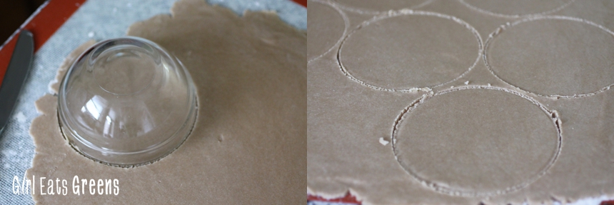 When you get it just right, pack it into a ball and then start rolling it out. Get it as thin as you can, and using a small bowl (or any other circular thing – a jar, cover, etc) to measure out circles for the empanadas. Re-roll any extras to try and use all the dough. Place the circles on a lightly greased baking sheet.