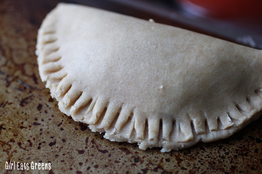 Because I used a traditional pastry dough recipe, and baked the empanadas instead of the traditional deep frying, they were definitely helped by the addition of a sauce. I wanted to incorporate a bit of spice, a bit of tang, and some cilantro to balance out the flavors of the ground “beef”. So I mixed up lime juice and a jalapeño with the cilantro and a little oil – and created a delicious sauce that can be used for topping or dipping. I also like to top with a little Daiya cheddar and some diced tomatoes just to get even more flavors and veggies involved – and there’s the bonus of making them look pretty.