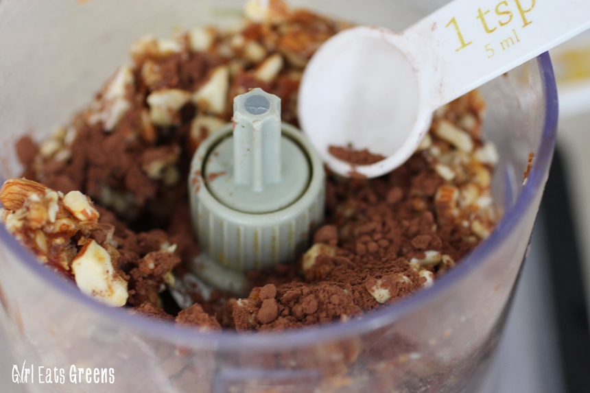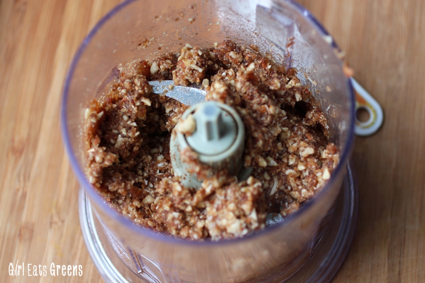 1. Start by making the crust. Add all the ingredients to your food processor and pulse until the almonds are pretty broken up and the dates are getting pretty sticky.