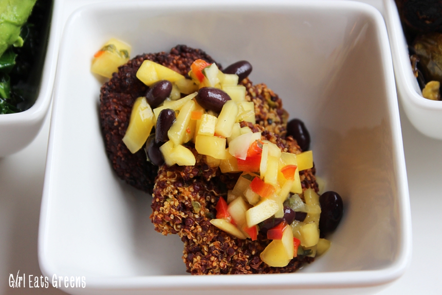 The quinoa edamame squash cakes looked a lot like my croquettes and definitely would have been something I would have liked. Especially since I thought mine didn’t need the yogurt. This dish was topped with a great salsa of sorts that looked so fresh and inviting I almost tried to steal it. The roasted brussels sprouts looked amazing as well, though of course I’m very partial to the sprouts.