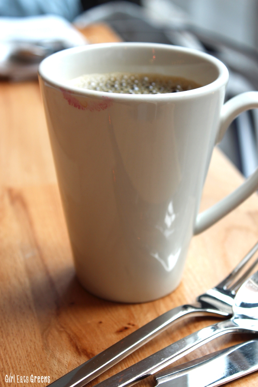 The restaurant definitely hasn’t exploded with people’s knowledge of it yet, and that’s a good thing. We managed to snag an open table (there were plenty to choose from) by the window for a full view of the space. There’s a live wall, juices served in mason jars, and an eclectic offering of cocktails that sound like juices. I’m of the mindset that it’s not really brunch without a cocktail, so I decided to try their cucumber spritz – which was a mixture of cucumbers, lime, and vodka. It was heavenly. Of course, I also went for coffee. It is brunch after all.