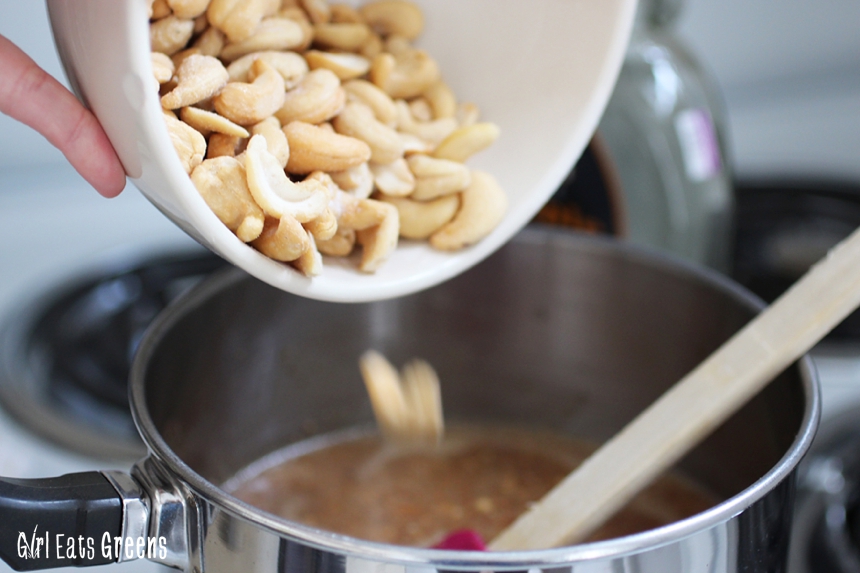 9. Then add the cashews and remove from heat. The mixture will seem a bit runny, but don’t worry, once it’s cooled it will firm right up.