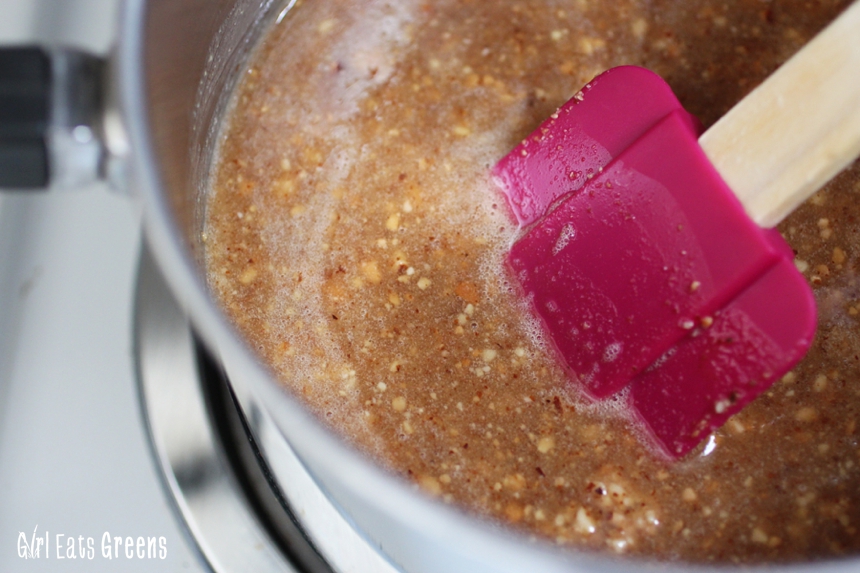 It starts with a base of almond butter, maple syrup, and coconut oil. I added a bit of Earth Balance vegan margarine for a little more buttery flavor. At the end, I added in roasted salted cashews so they were nice and coated with the sauce  – and I have to say, it was such a simple recipe I wish I had thought of it myself! Who knew that all these random ingredients added up to caramel?