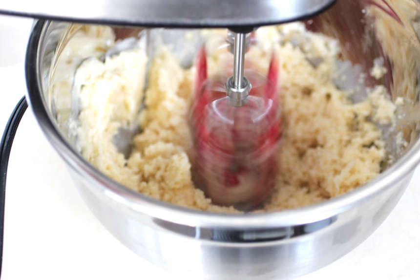 2. Start with the base. With a hand mixer, beat the butter and sugar together until they’re nice and creamy. Add the vanilla extract and beat until incorporated.