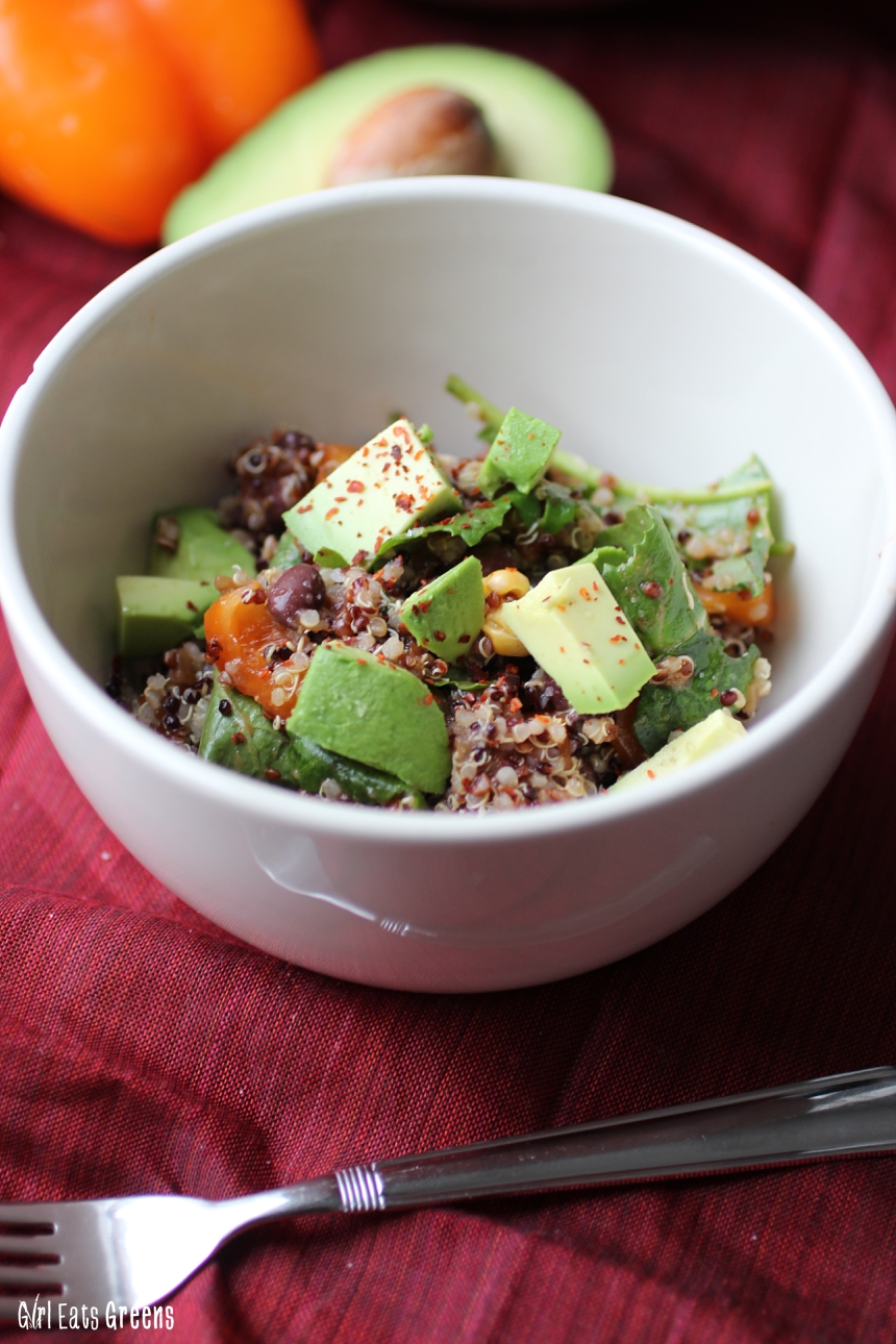 I love the combination of flavors and textures in this bowl. There’s a bit of spice, some crunch and tart from the peppers and greens, and the smooth addition of avocado really tops it off nicely. What I love about this bowl is it’s super quick to make, and it’s really versatile. If you don’t have one of the ingredients on hand, leave it out or add something else. Don’t have black beans? Throw in some chickpeas or tofu instead. You really can’t go wrong.