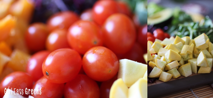 I put together this salad with the rainbow in mind. I had a lot of veggies on hand, and then went out and grabbed some additional to fill out the colors. It has tomatoes for red, zucchini for yellow, a pepper for orange, radicchio and sprouts for purple and spinach, lettuce, sprouts, and cilantro for green. I added in some tofu and quinoa for white, because I guess I needed some added protein and well white should be a color too.