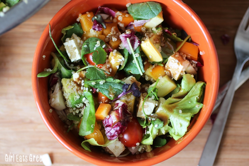 Even if you’re not a big salad fan, I feel like a good dressing can really take things to the next level. For this one, I decided an Asian-inspired dressing would go really well. So I used a bit of sesame oil, olive oil, some balsamic, soy sauce and a touch of tahini as the base. I added in a bit of garlic powder and decent amount of ground ginger and POW. It was a flavor explosion. Add that to a mixture of fresh veggies and you’ve got a meal everyone can enjoy.